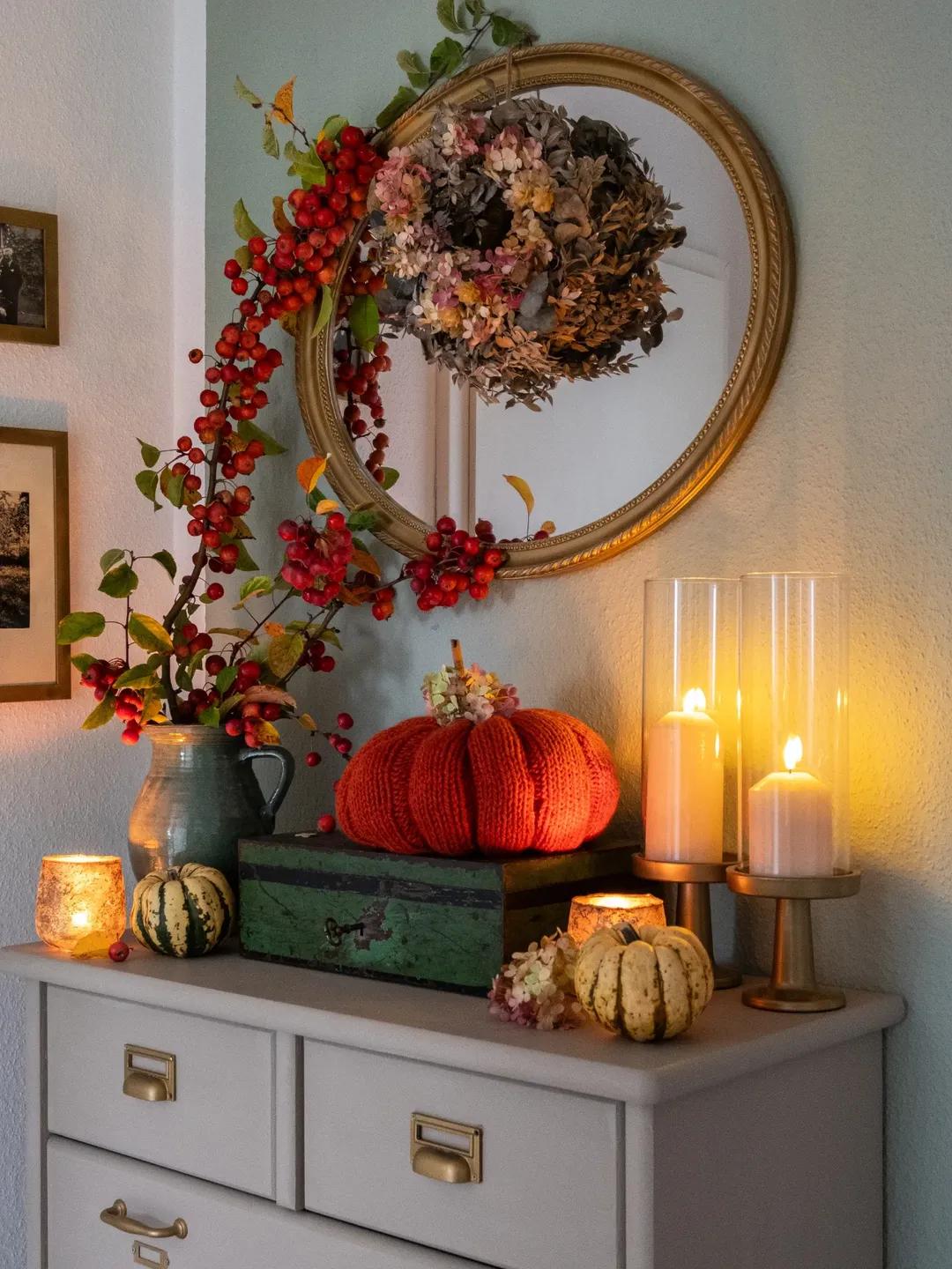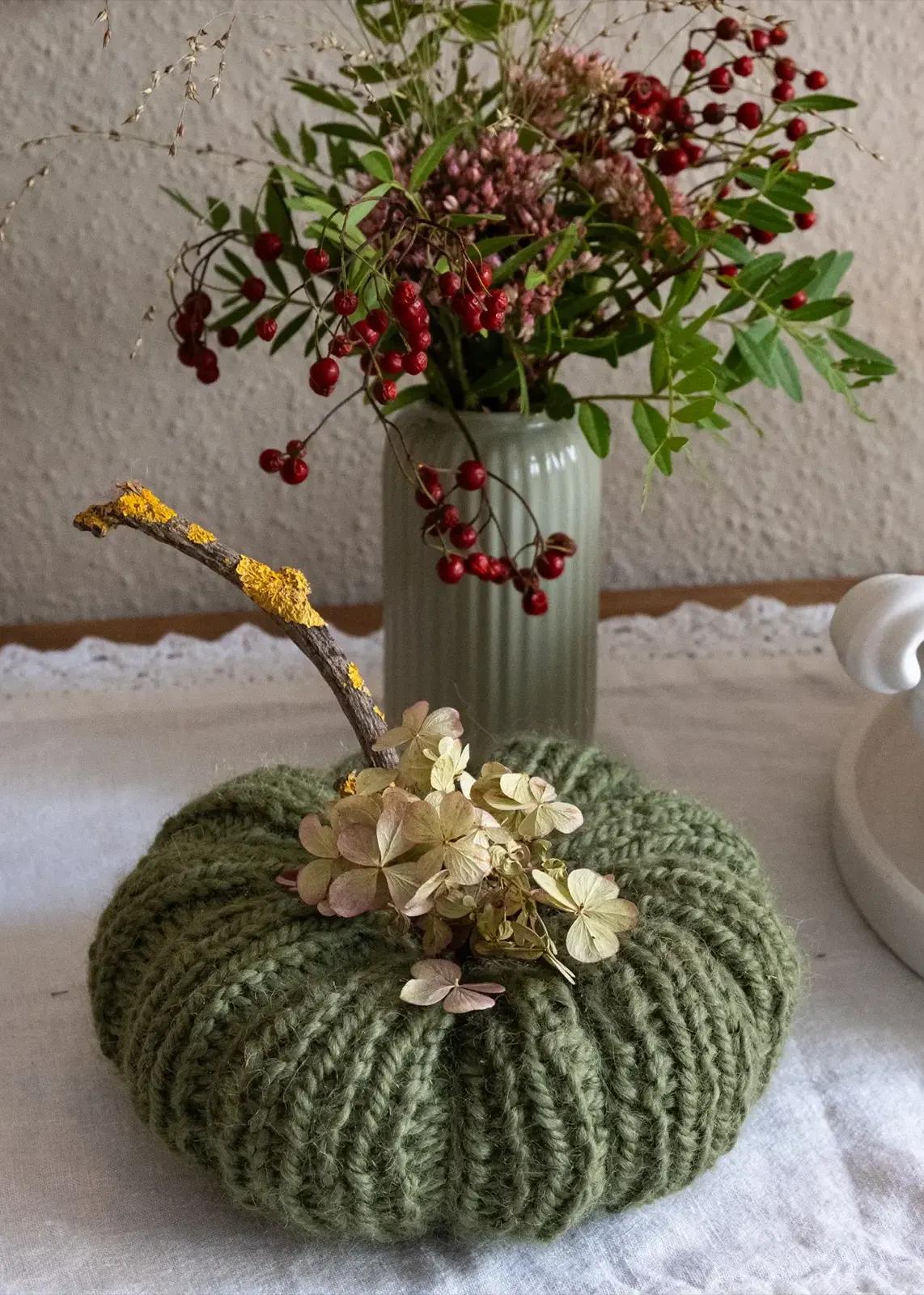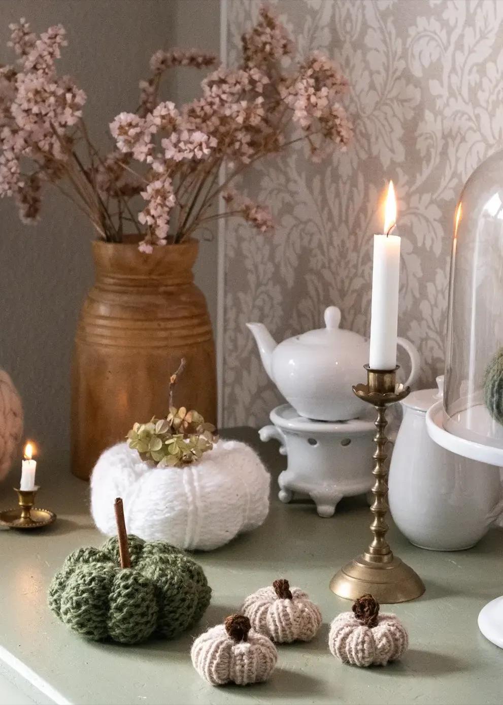 Muted shades of green and orange are the ideal palette for autumn interiors. Decorative pumpkins grown in the family garden have become part of the November décor. The homeowner found an unusual use for them: they’re now vases for dried flowers.