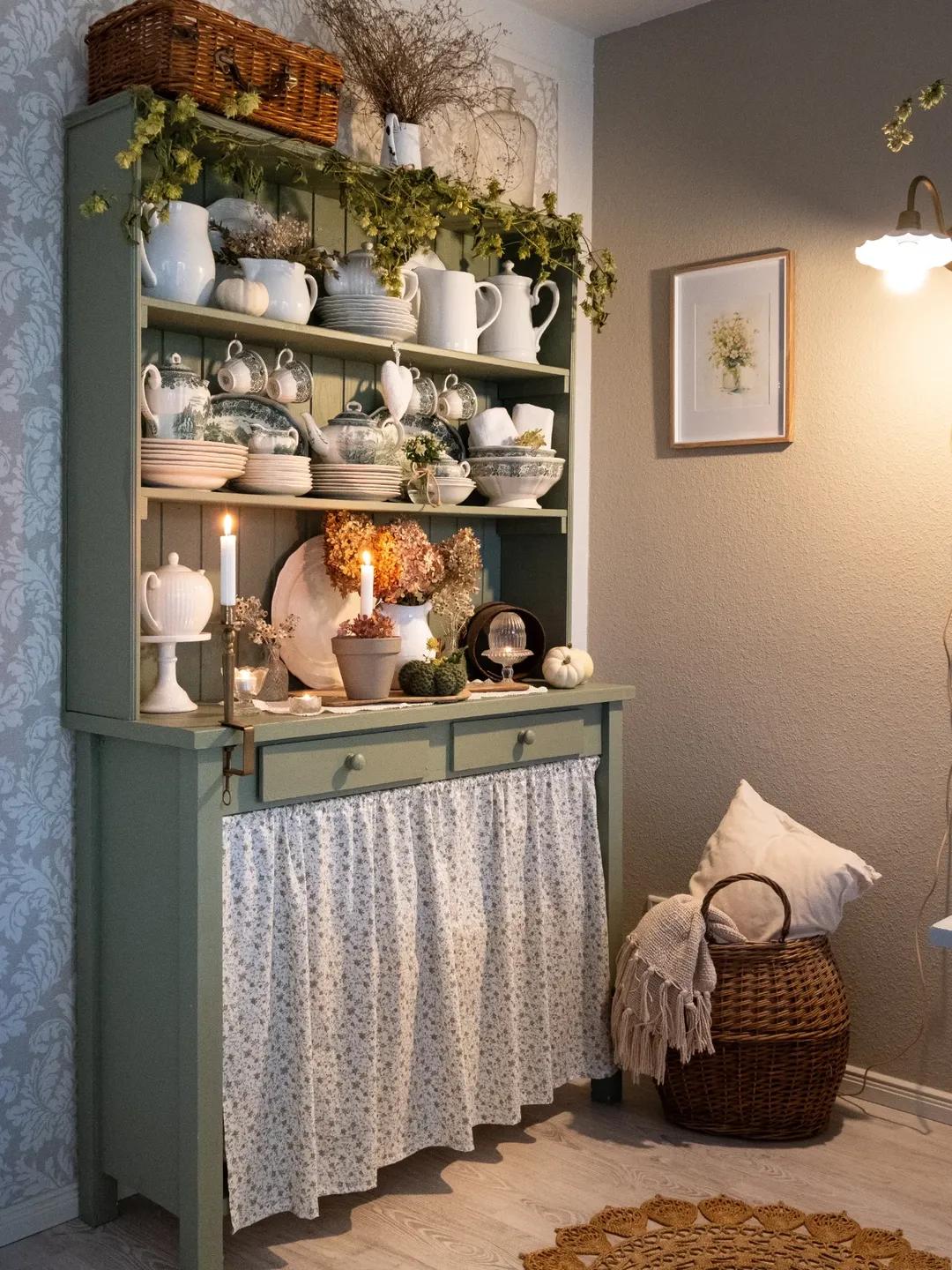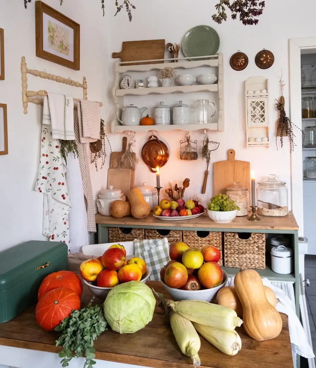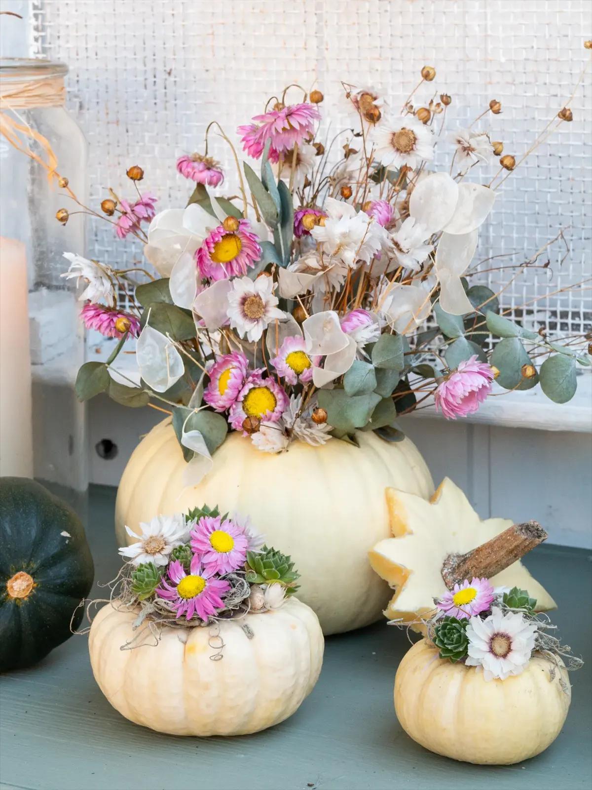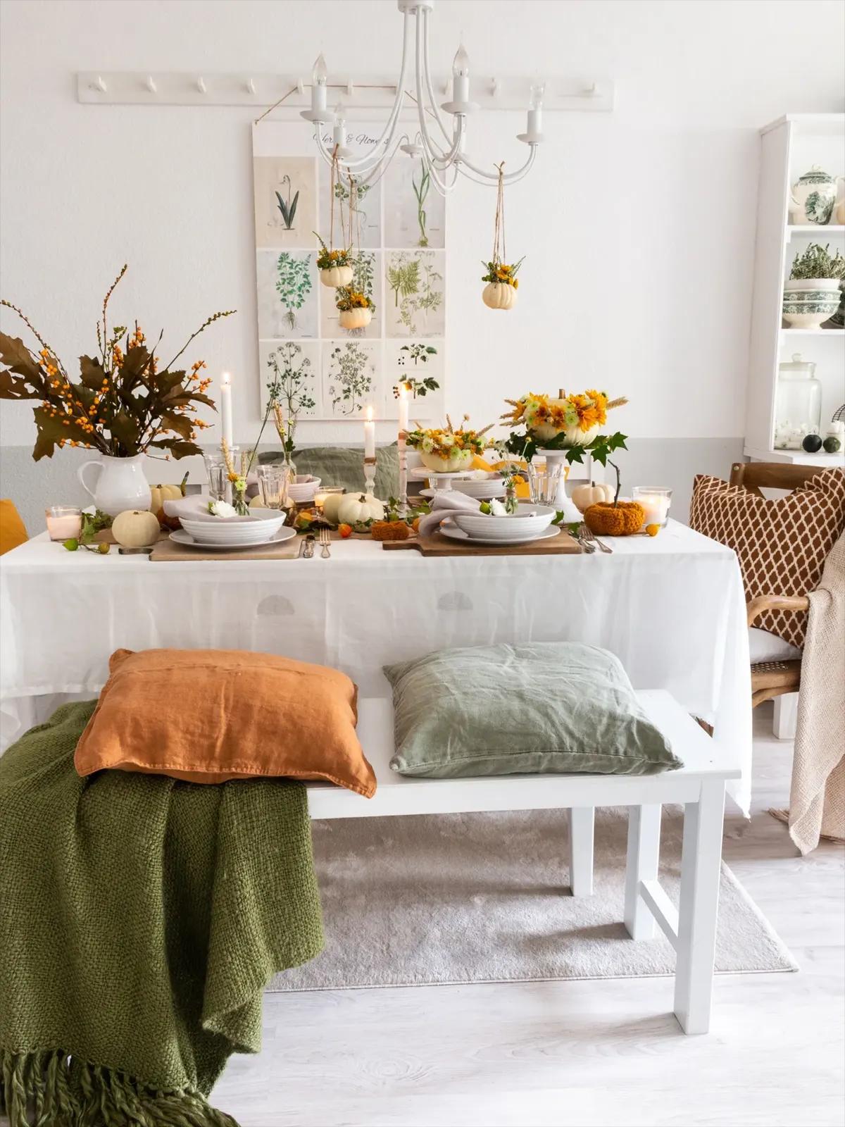 Muted shades of green and orange are the ideal palette for autumn interiors. Decorative pumpkins grown in the family garden have become part of the November décor. The homeowner found an unusual use for them: they’re now vases for dried flowers.