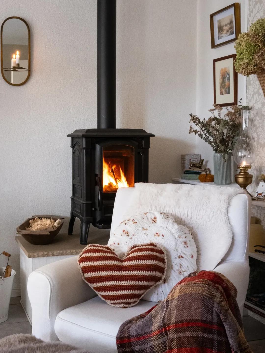For example, a cozy heart-shaped cushion on the chair by the stove was knitted from leftover rust-brown yarn — the color of autumn leaves. This little detail fit perfectly into the old German cottage’s interior, adding softness and a warm mood.