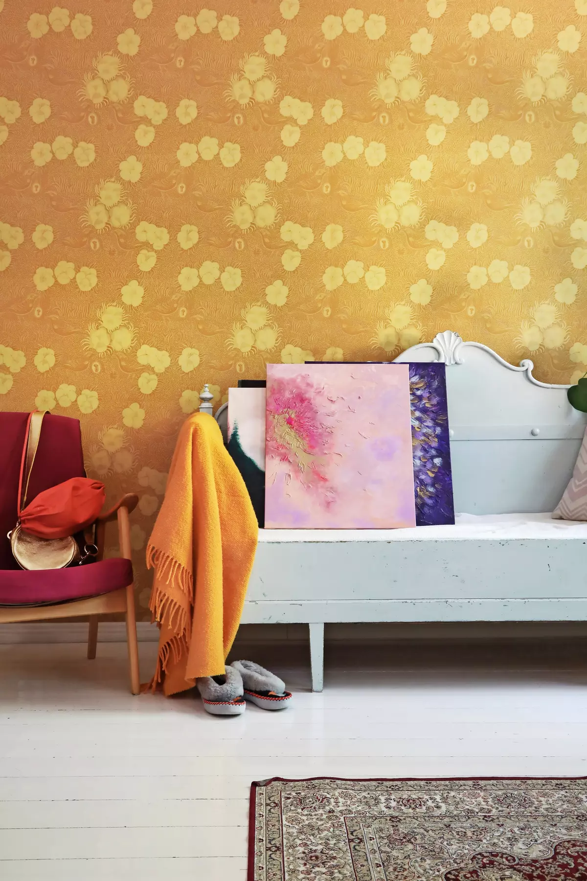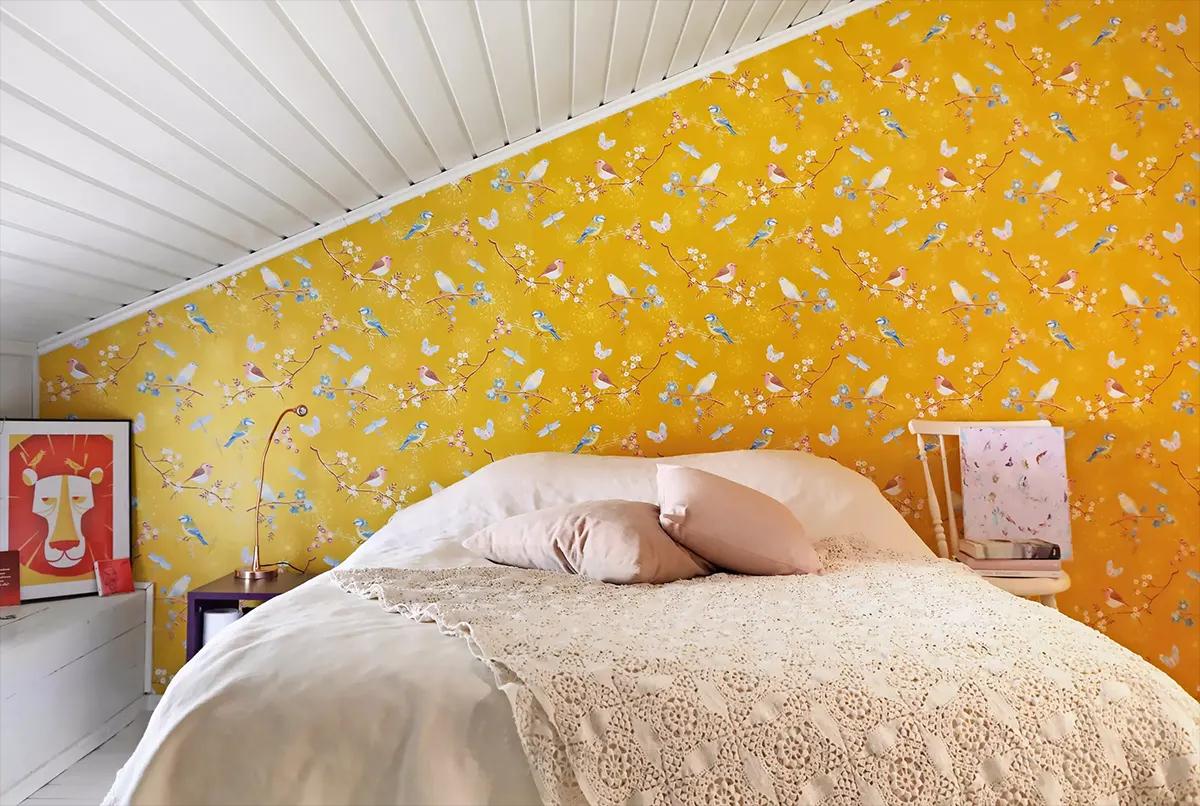 Minna also made an accent wall in the living room, just like in the kitchen — bright yellow wallpaper by Birger Kaipiainen.