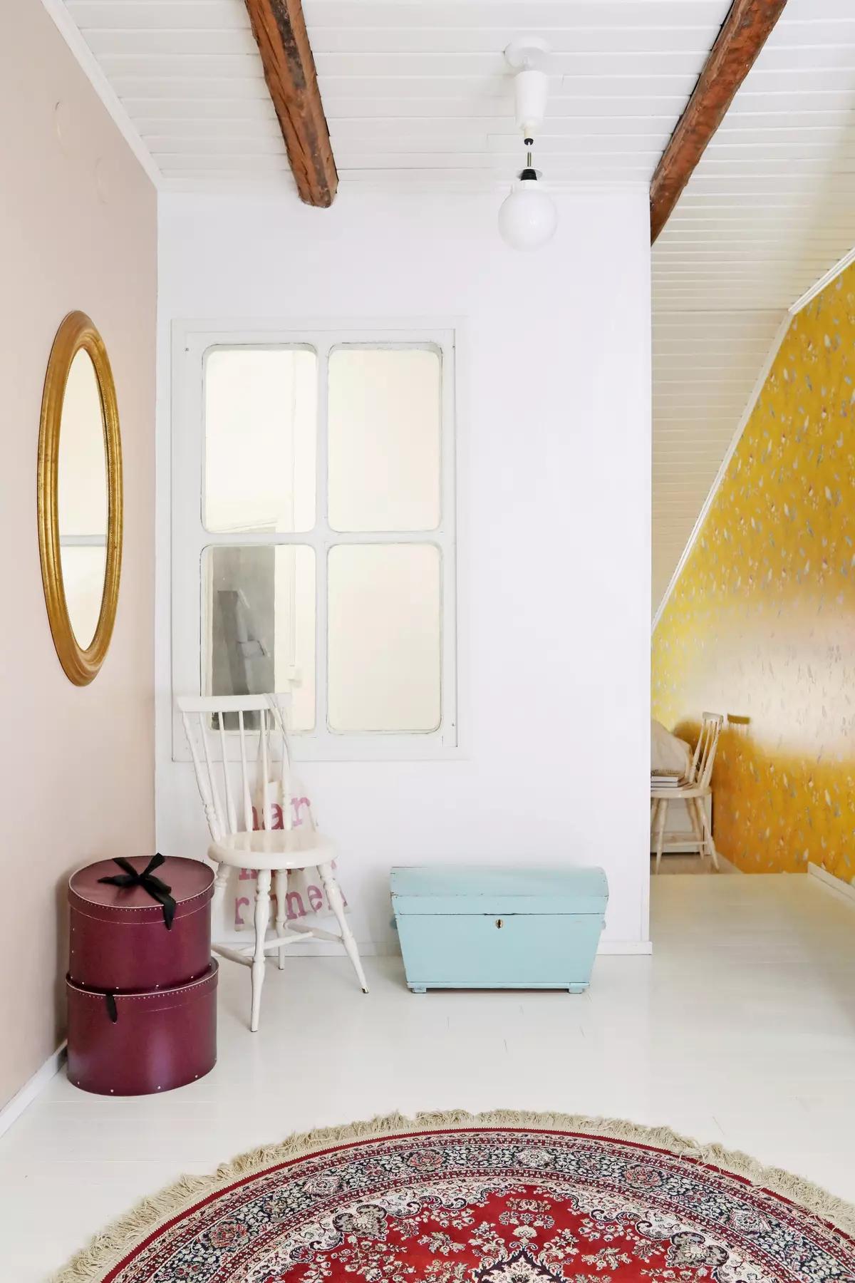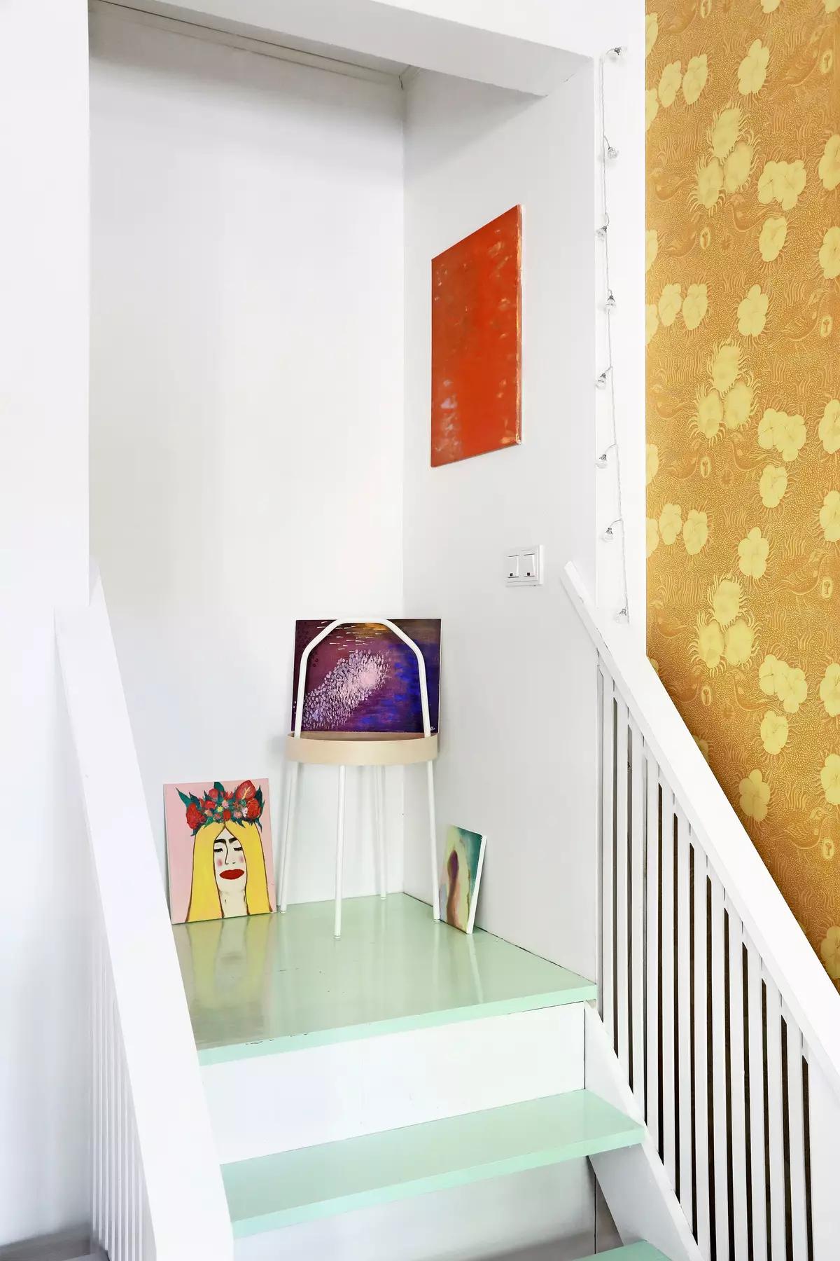 They painted the staircase mint, and that little change instantly refreshed the whole spot. When Minna put up a mini-exhibition of her works on the landing, the area felt even cozier and brighter.