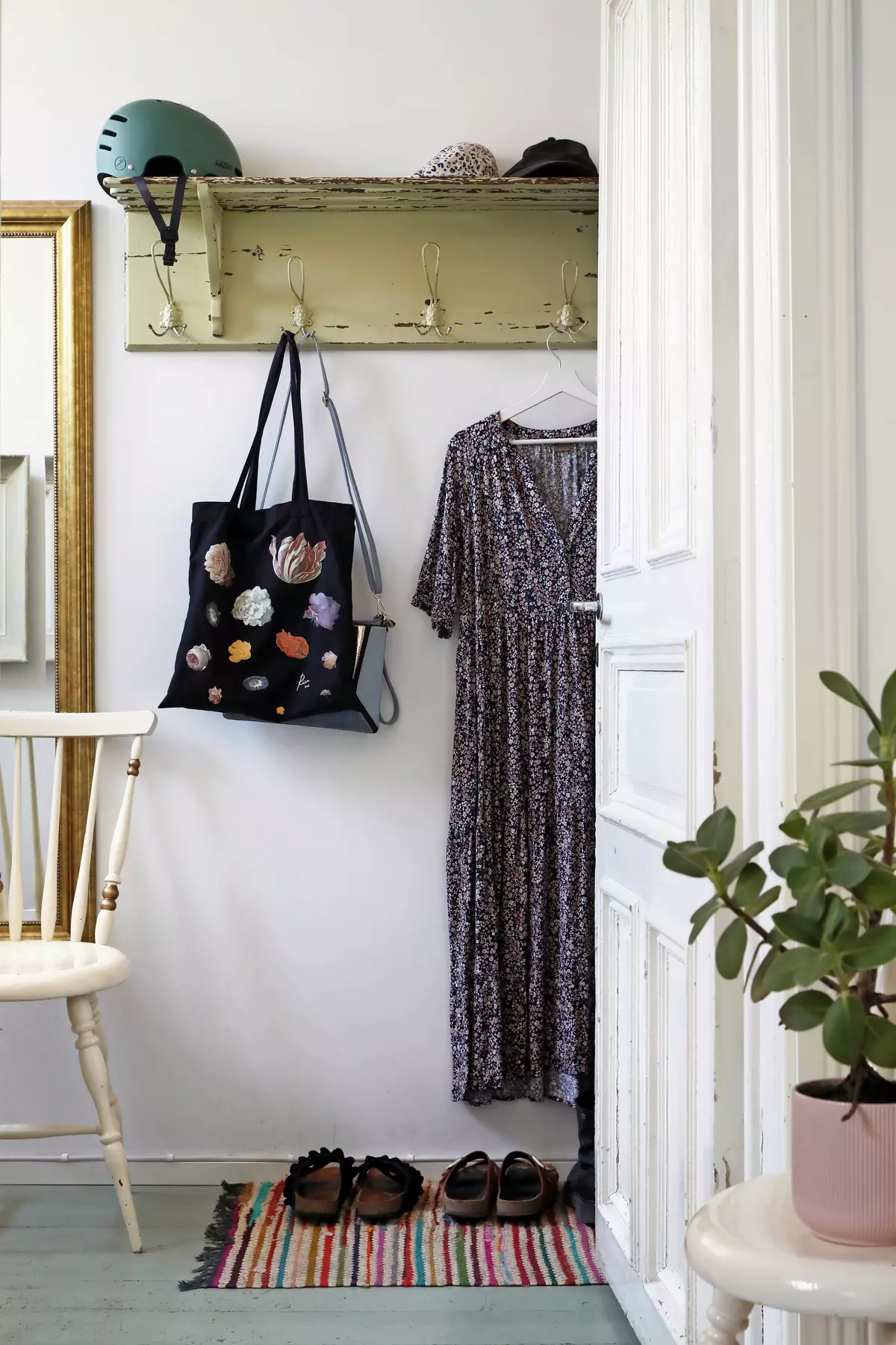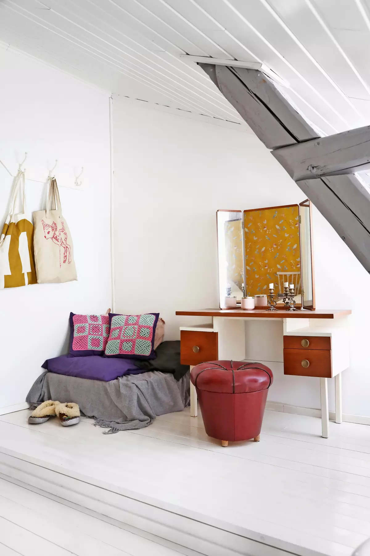 In the photo above, you can see the small walk-in closet where Minna gets ready each morning. The mirror is her essential tool — she works as a hairdresser and likes to look put together.