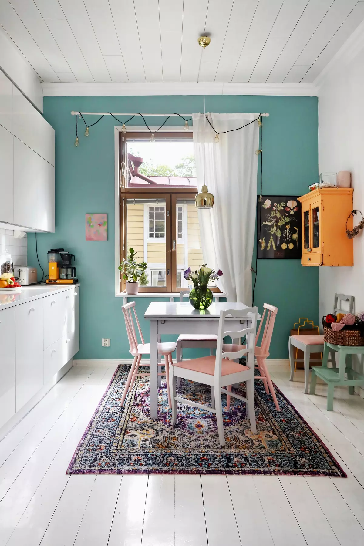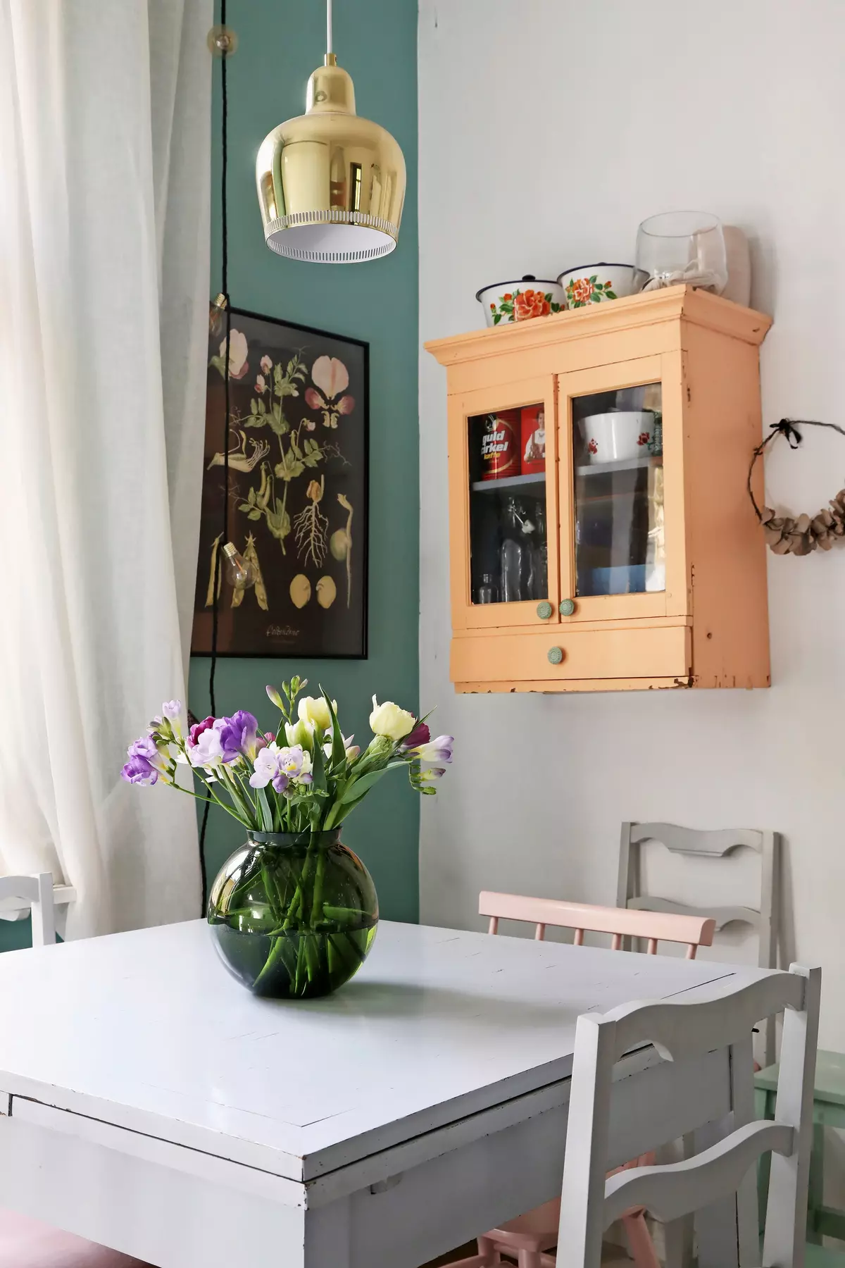 Minna painted one wall in the kitchen a minty accent color (Tikkurila, shade “Mentol”). The old chairs used to look different — she restored and painted them a soft pink.