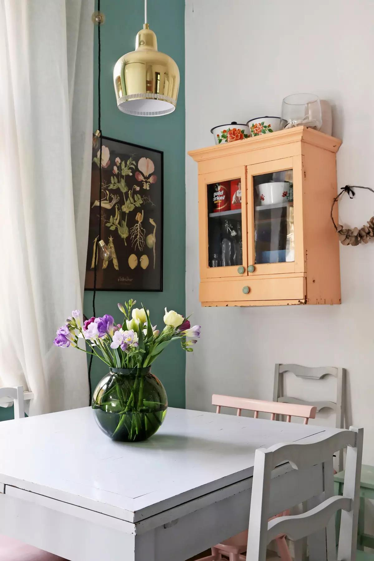 At the same time, there are no expensive pieces here. Almost everything was bought at flea markets or via classifieds. For example, Minna found the wall cabinet for dishes in a thrift store.