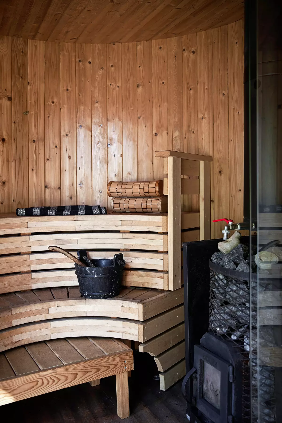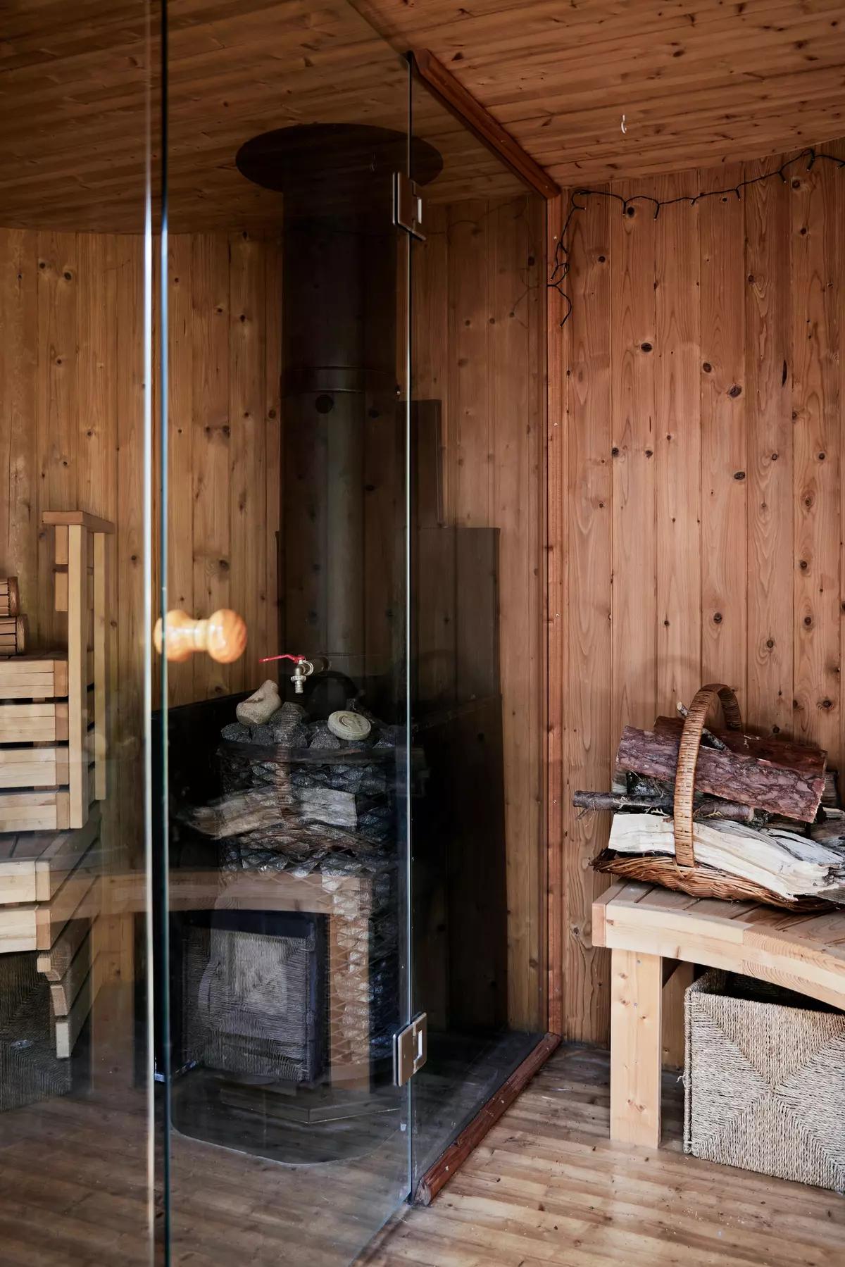 In the photo below, Sophia stands next to the sauna — it’s a tempting place to steam. The sauna sits a short distance from the house and looks a bit like a small guest house. It was built in the same style as the main house.