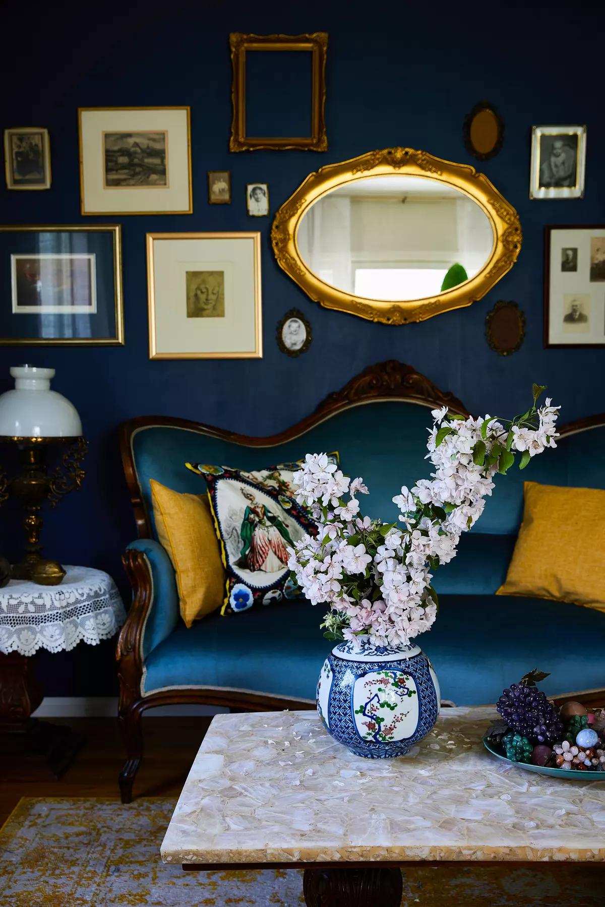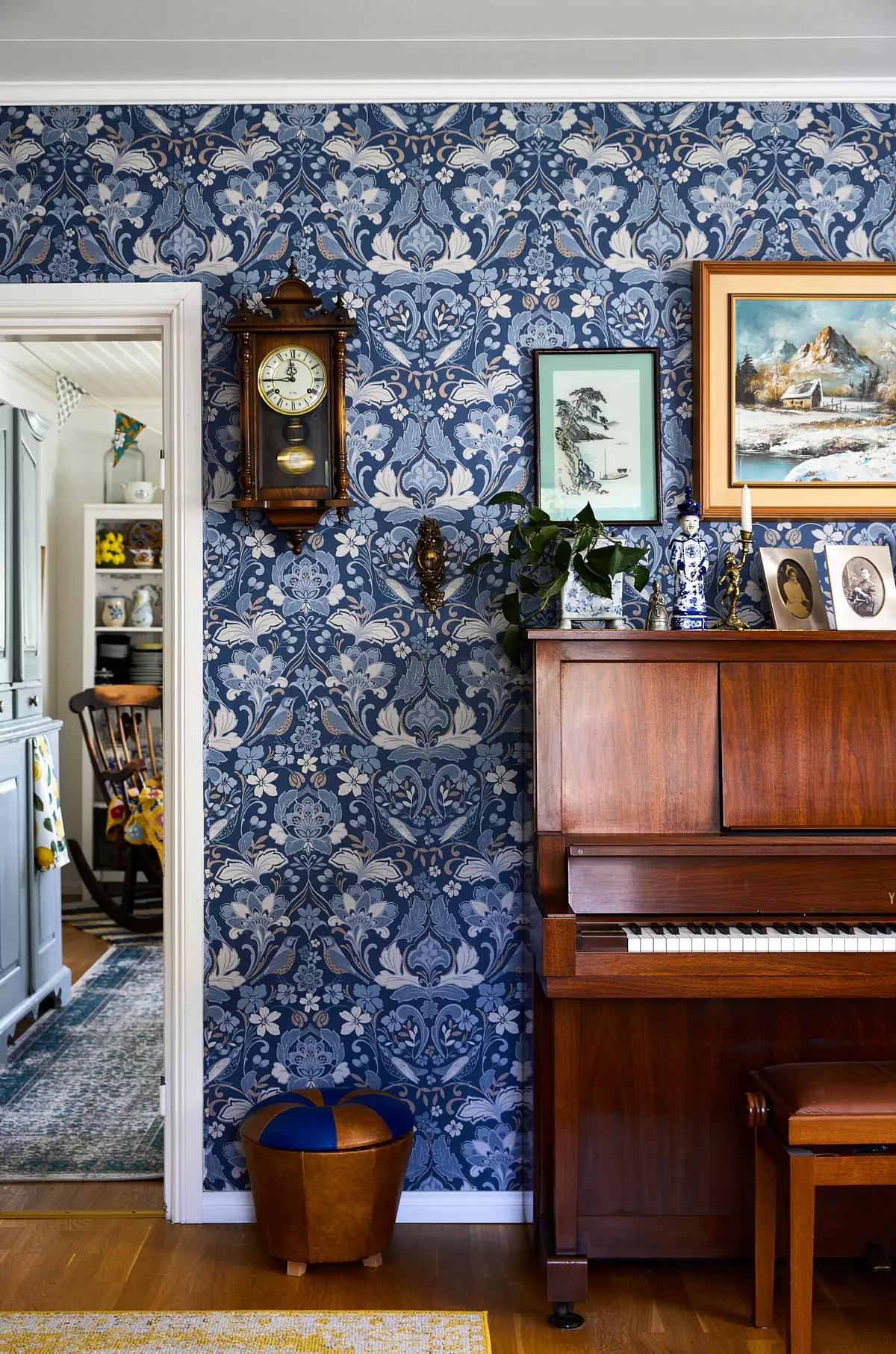 The Arthouse wallpaper stayed from the previous residents and fits perfectly into the interior Sophia created. The old brown piano looks great against the blue wallpaper. A gold-and-blue ottoman bought at a sale ties the living room elements together.