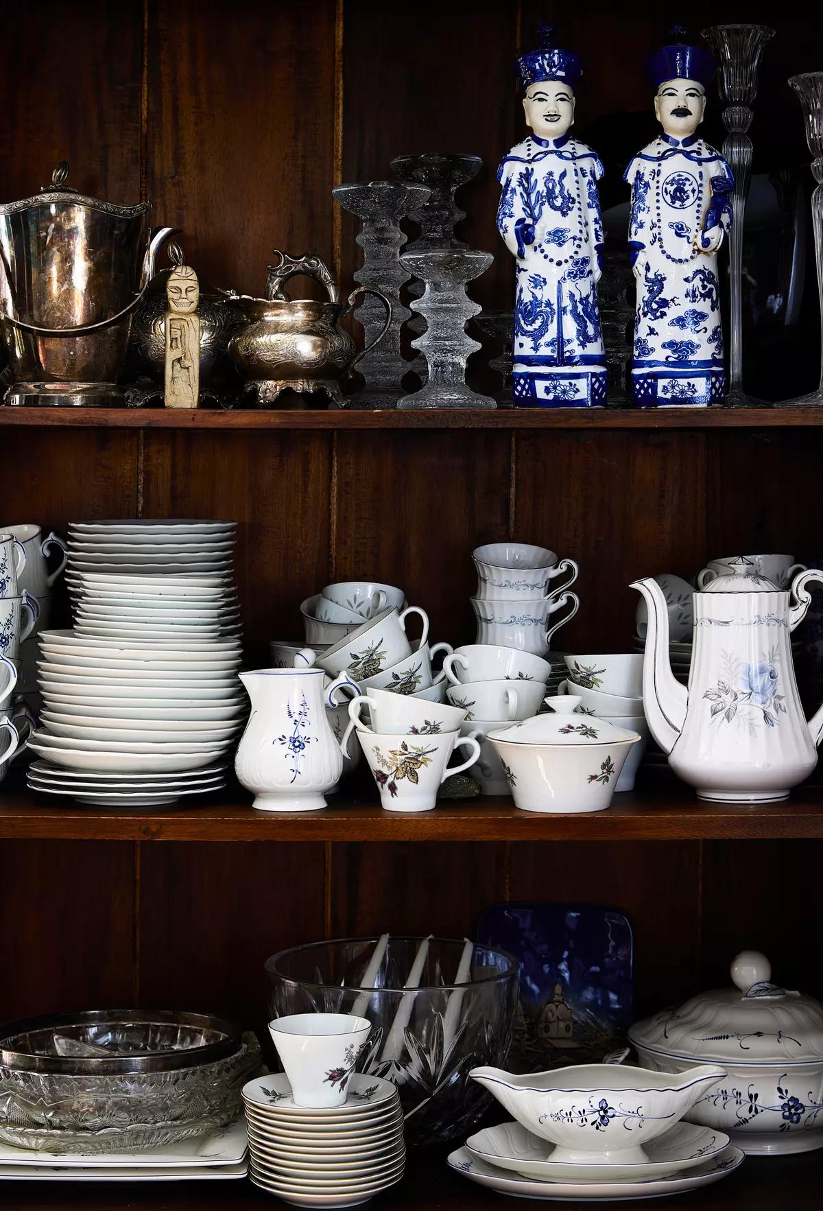 A large collection of jugs and vases Sophia has gathered over a lifetime is kept in a glass display cabinet. She enjoys wandering flea markets and finding unusual pieces. White-and-blue jugs are especially dear to her.