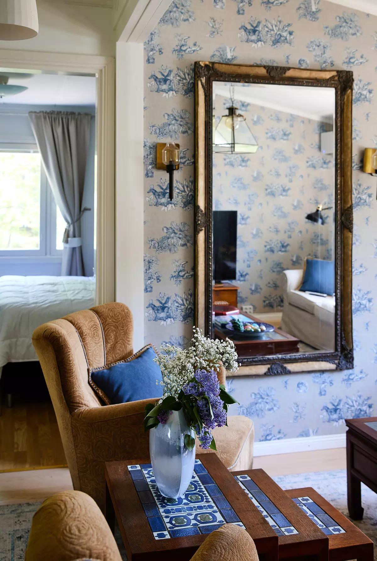 The living room wallpaper is from Rebel Walls. The armchairs remained from the previous owners. The rug is from Carpetvista (the well-known Swedish brand from Malmö that supplies rugs to many countries).