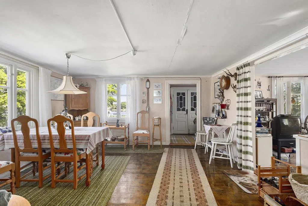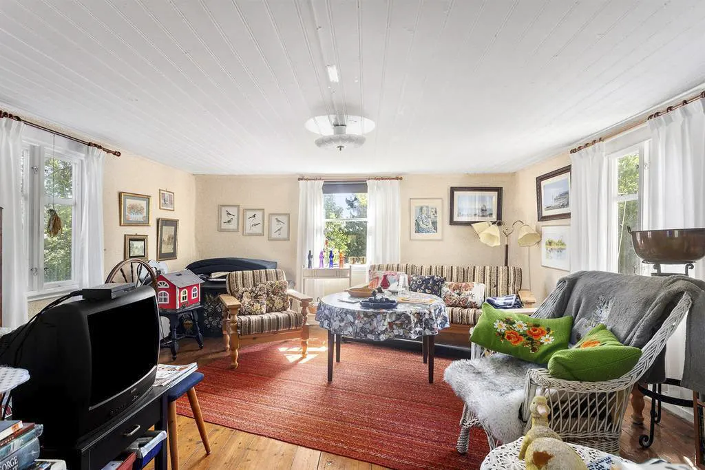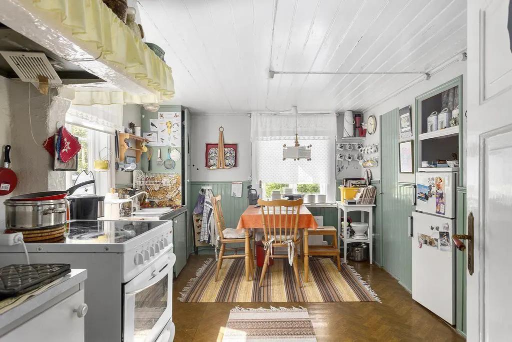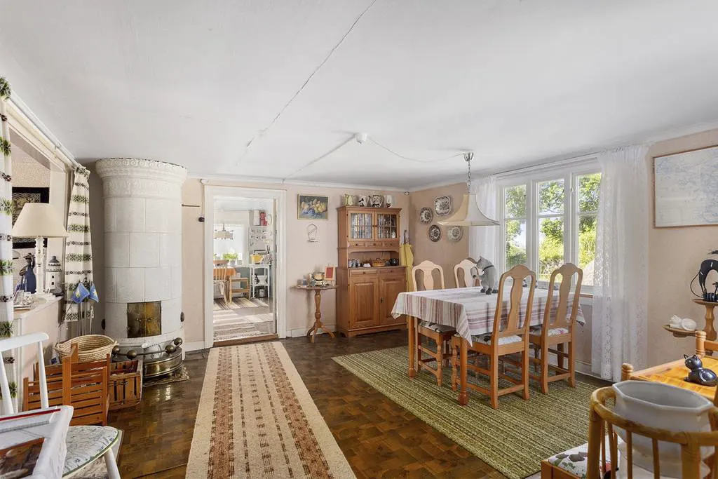 At first glance this old house looks like a traditional Scandinavian summer cottage. It’s small — just 77 square meters (≈830 sq ft) — with a pale-yellow facade. Inside: wooden floors, tiled stoves, a fireplace, hand-woven rugs and vintage furniture. The unpretentious interior feels less like a year-round home and more like a cozy spot for summer getaways.