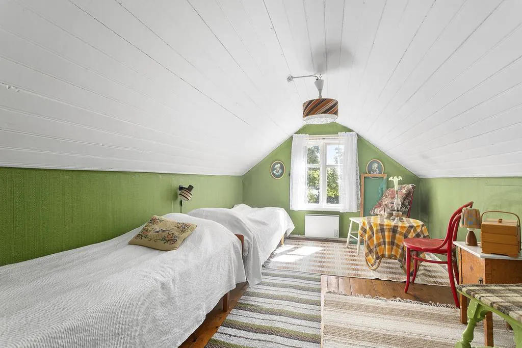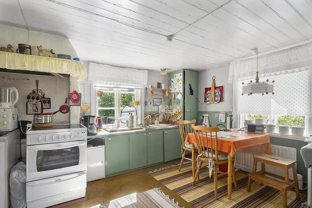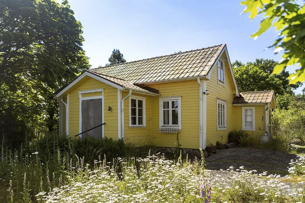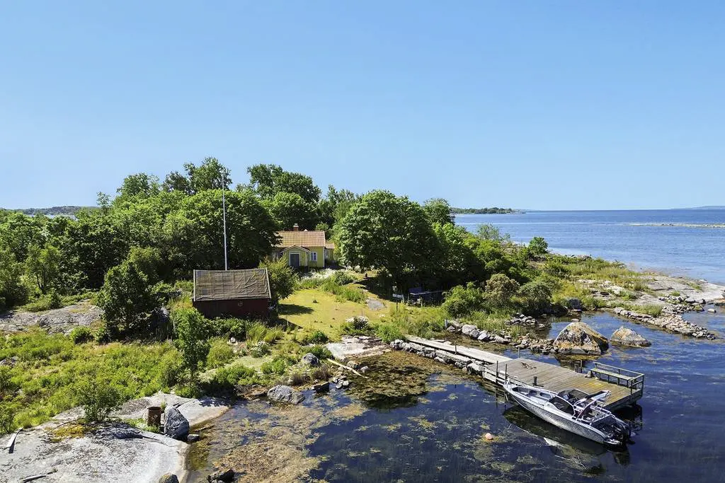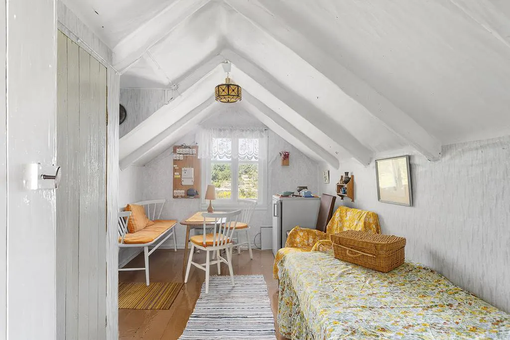 The house has five rooms, including several bedrooms, a cozy living room with a stove, and a study. In the yard there’s a shed and a sauna. See our feature to get a closer look at the interior of this unusual Swedish cottage on a secluded island.